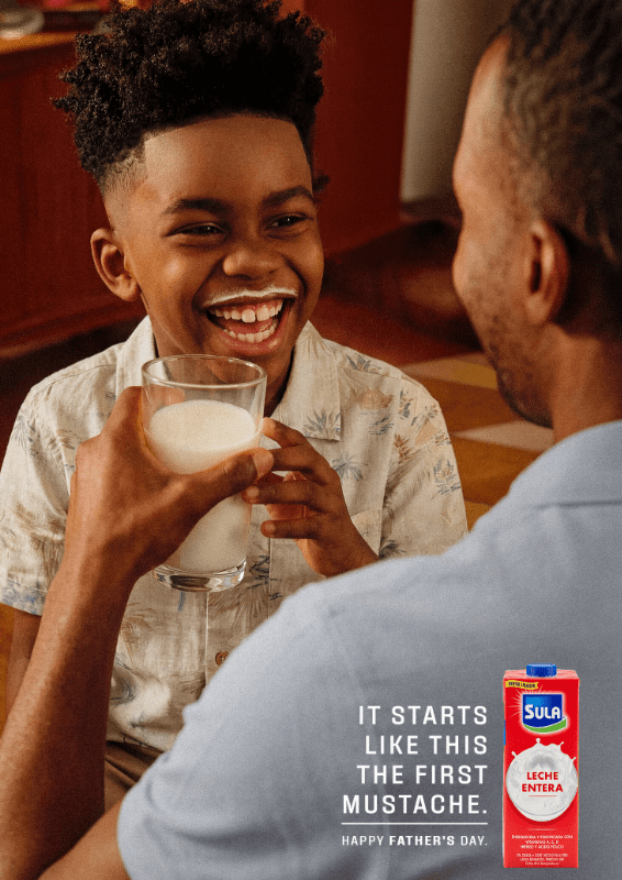 “The First Mustache” is a print advertisement published in Honduras in 2026. The ad campaign has multiple versions of the same ad. Each image shows a father and a son holding a glass of Sula milk, the product of focus. The child in each ad has a milk mustache running across their upper lip. In the bottom right corner of the ad, text reads, “It starts like this. The first mustache. Happy Father’s Day.” The appeal used to evoke an emotional response is humor.