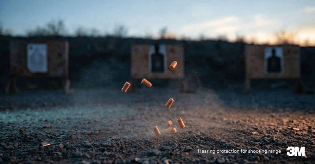 The product featured in the “Shhhting Range” ad is 3M hearing protection. In the background of the advertisement, paper shooting targets are visible at a gun range. In the center of the ad, a number of earplugs are falling to the ground. The earplugs falling to the ground are suggestive of bullet casings and the typical way that rounds eject from a gun. The technique used in this ad is one of humor and novelty, as a viewer can appreciate the cleverness of equating a product used for hearing protection with the loud, damaging noises of gunfire.