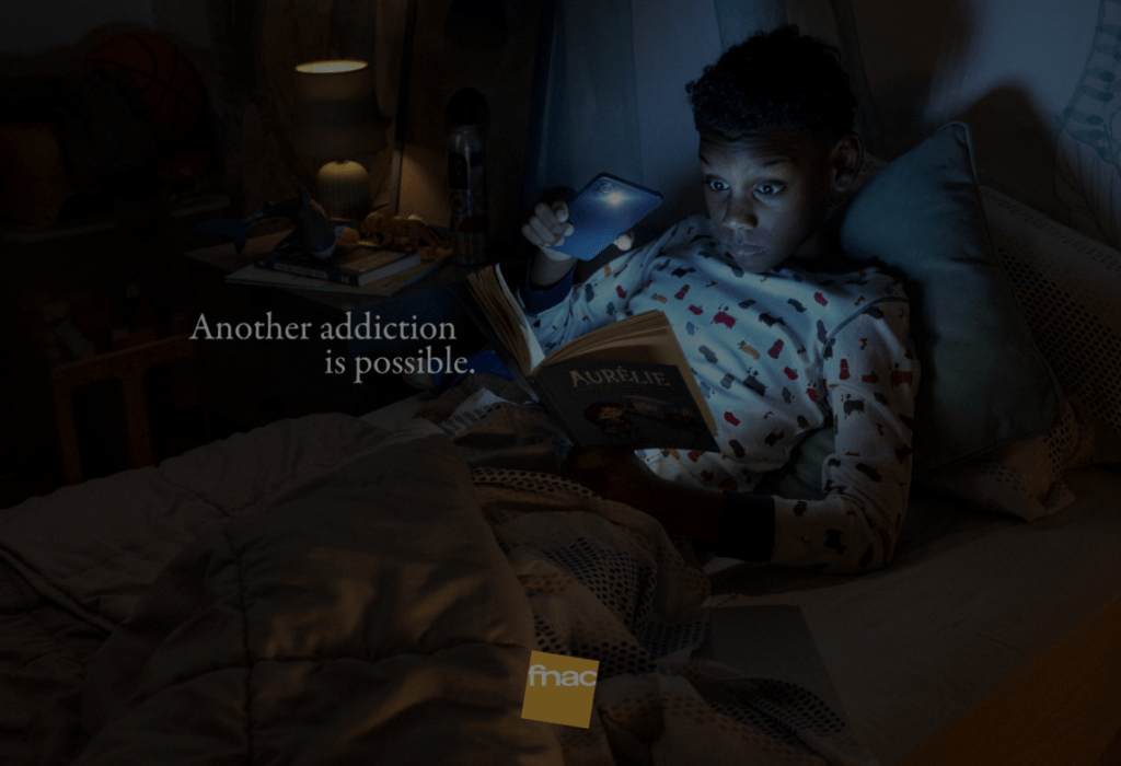 “Another Addiction is Possible” is a magazine ad campaign by Fnac, which is France’s largest bookseller. In the images, a younger child is holding their phone and using the flashlight feature to read a book in a dark room. The appeal that evokes an emotional response is a bit of humor and irony. Current messaging in society around cell phones is that the younger generations are addicted to their digital devices, and the ad’s tagline implies reading as another addiction that may be possible.