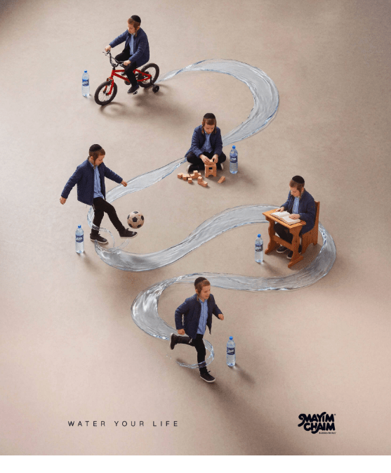 “Water Your Life” is a magazine ad campaign promoting Mayim Chaim Kosher Seltzer water to the Jewish community. The ads each depict a Jewish man or child wearing a yarmulke and performing various tasks throughout the day that a Jewish person might do. Restoring a grandfather clock, reading, studying, working, polishing silver, reading from the Torah, playing with their children, listening to music, playing the guitar, and other activities. Linking each task to another is a stream of water. Underneath the visual depiction are the text “Water your life” and the company’s logo. The technique used to evoke an emotional response is peace and a sense of continuity. The images follow a person through the activities that they may undertake in a day, and through it all, water is there to power them along.