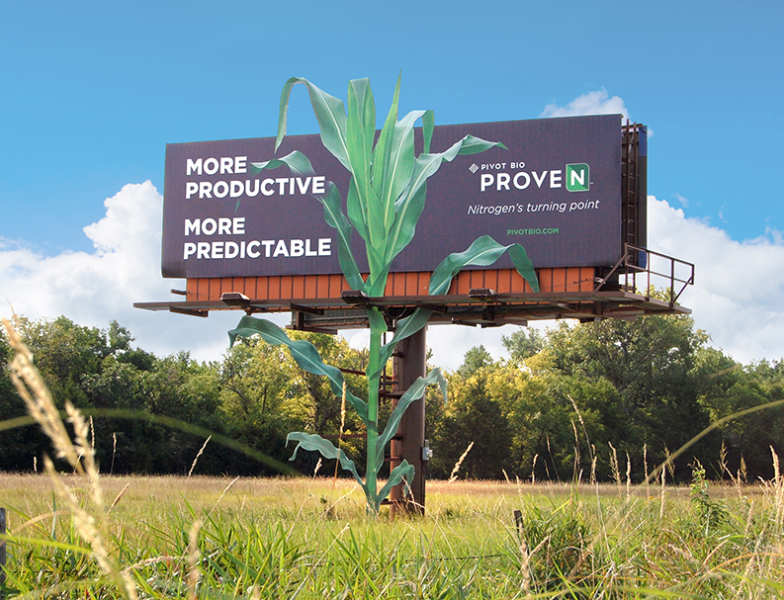 “Nitrogen’s Turning Point” is an outdoor billboard ad by Pivot Bio promoting its nitrogen product to farmers and other crop growers. The billboard features a large canvas with the ad, and large corn leaves protrude from the top. In front of the billboard post, an extension of the ad features a large corn stalk and additional leaves, making it appear as if a huge corn plant, as tall as the billboard itself, is growing straight out of the ground. The technique used to evoke an emotional response is humor and novelty. It’s not very often you see a massive corn plant growing out of a field.